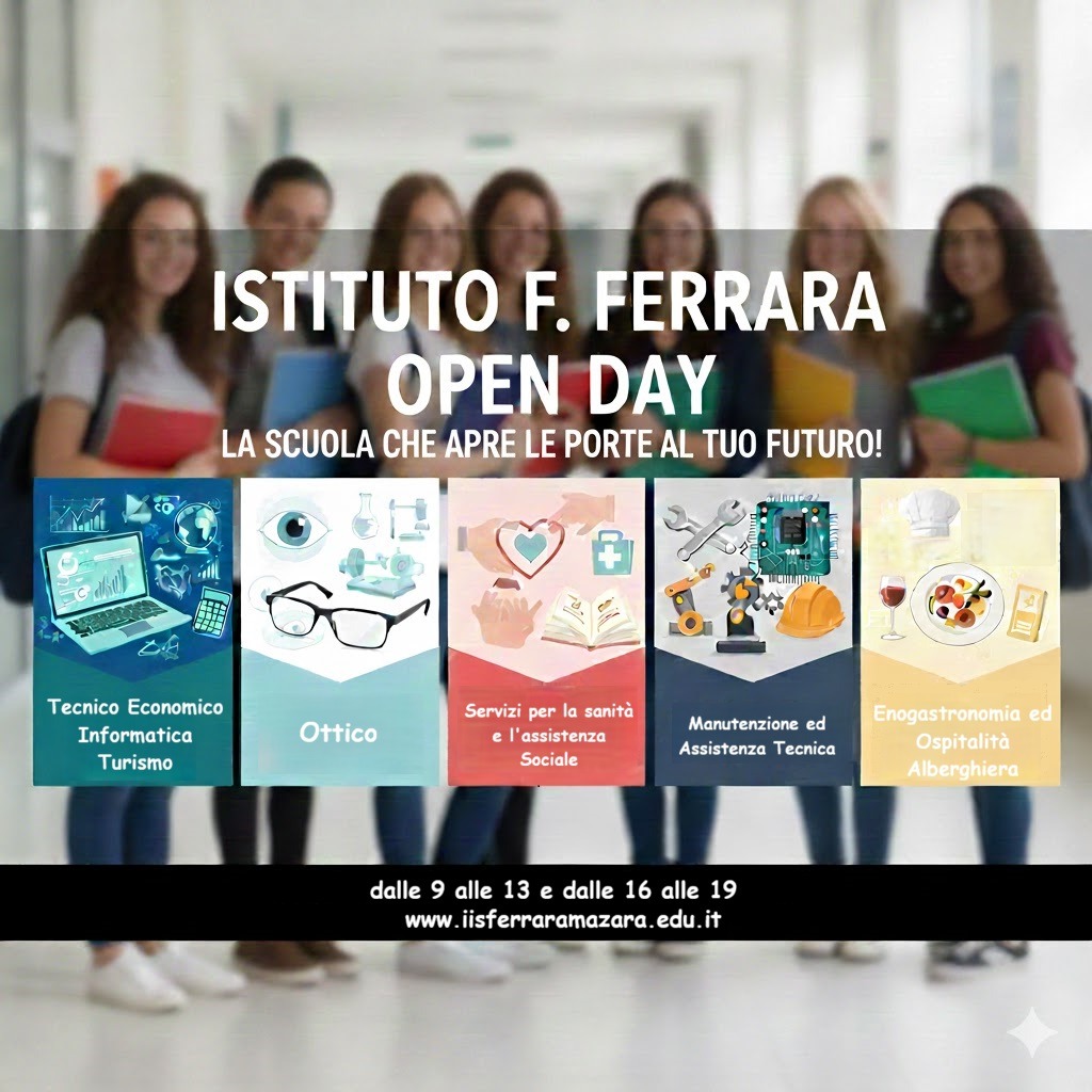 Domenica 14 Dicembre 2025 si svolgerà il secondo Open-day del nostro Istituto. In questa giornata, verrà fatta conoscere l’offerta formativa e le strutture delle due sezioni che compongono l’IIS Ferrara :